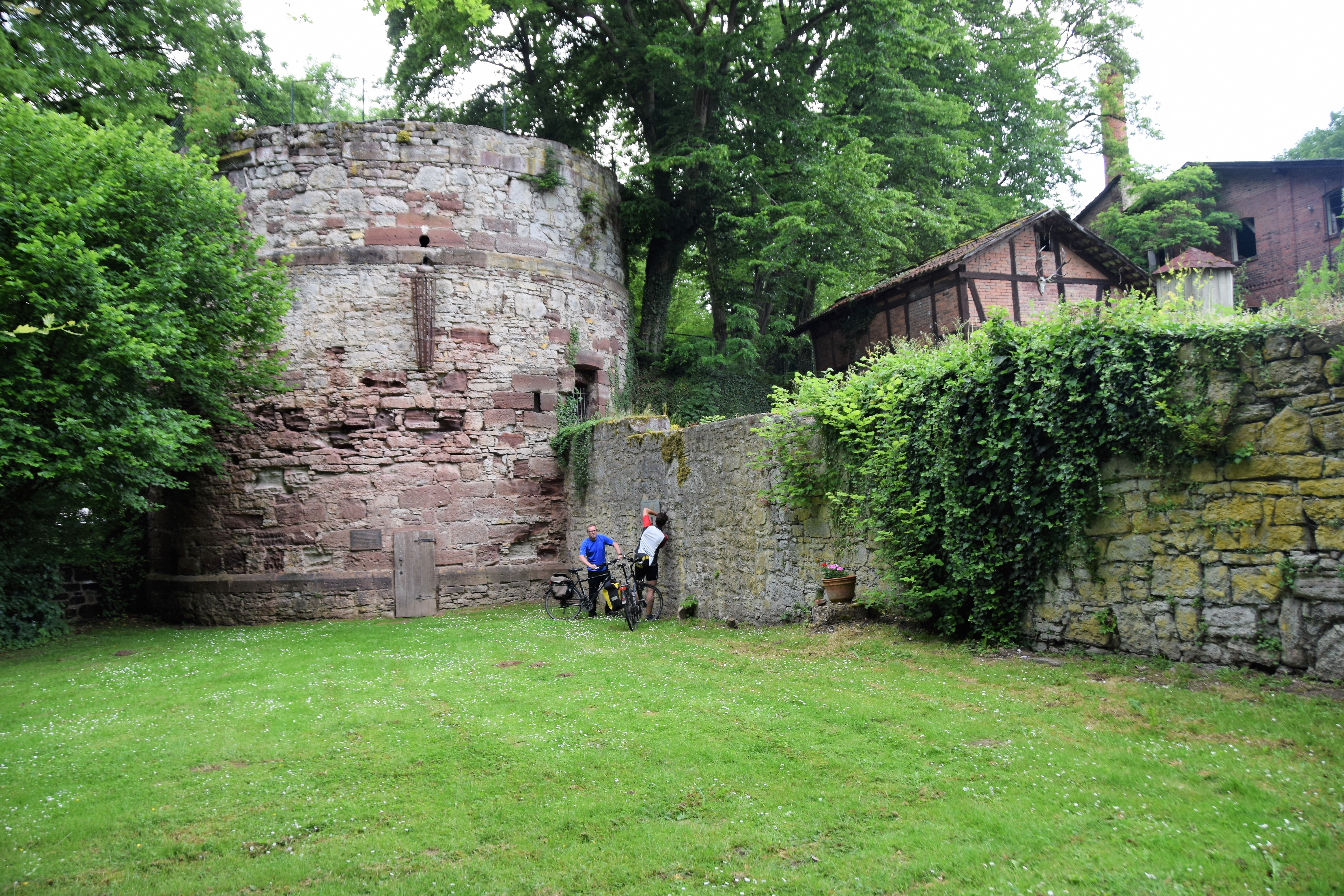 Gegen Mittags, wir hatten gerade einen der höheren Hügelrücken erklommen, zeigte uns die Wetterapp: das Gewitter ist in einer halben Stunde da. Zum Glück hatten wir im letzten Ort ein Café gesichtet, dass sich als besonders fahrradfreundlich beworben hat. Es lag ja auch am Europaradweg R1. Hügelabwärts ging es dann schnell und wir erwischten das Cafe vor dem ersten Tropfen. Es waren dann doch eher ein Schauer als ein Gewitter, aber wir saßen trocken unter dem Sonnenschirm.