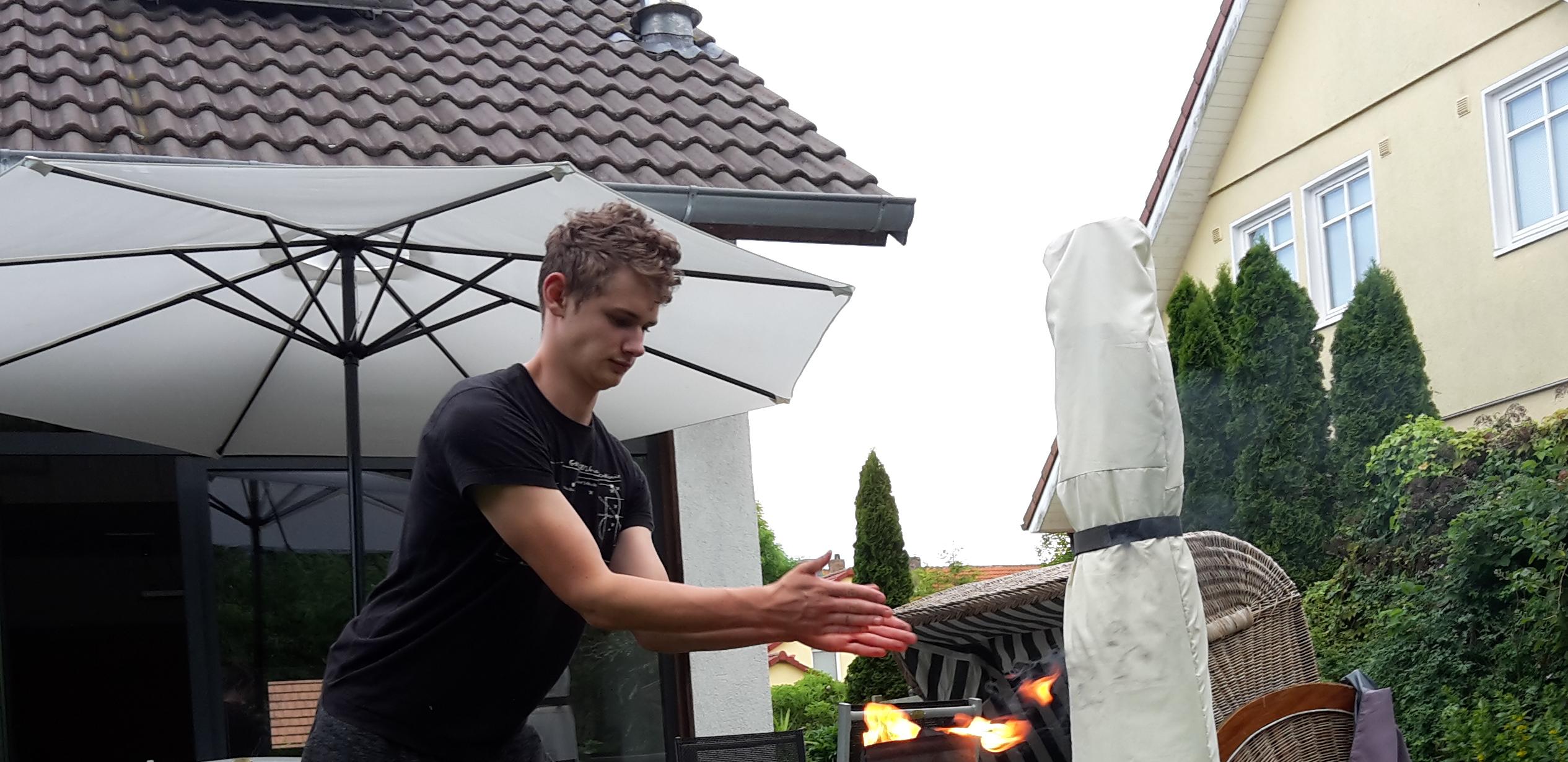 Heute hat Finn uns den Grillmeister gegeben. Er hat das Feuer im Grill entfacht, und dass nicht ohne es möglichst cool abzufeiern.
