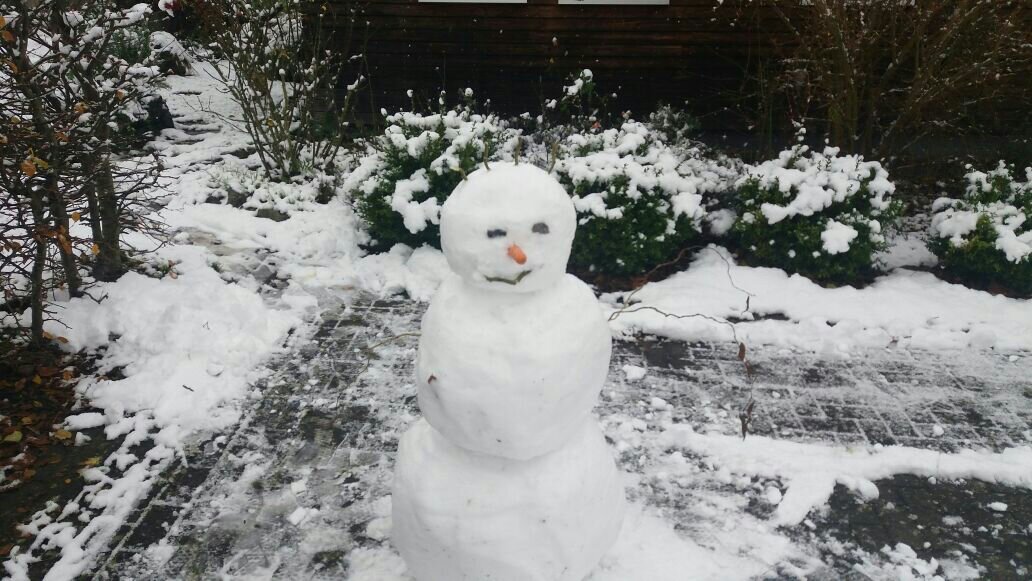 Als ich heute morgen aufwachte dachte ich erst, wer hat den schon wieder Licht angelassen. Ein zweiter Blick zeigte aber das Licht kam von draußen, es hatte geschneit. Der zweite Gedanke war dann, mit den Sommerreifen wird Antje Finn gar nicht zu seinem Hallenspieltag nach Hannover fahren können. Damit war mein Vormittag besiegelt. Ich musste die Winterreifen aufziehen. Dafür durfte der Rest der Familie sich um das Frühstück kümmern. Antje war zuerst ein wenig am zetern, konnte dann aber die Jungs überreden Brötchen zu holen. Moritz wurde im Schnee wieder Kind und musste erst mal einen Schneemann bauen.